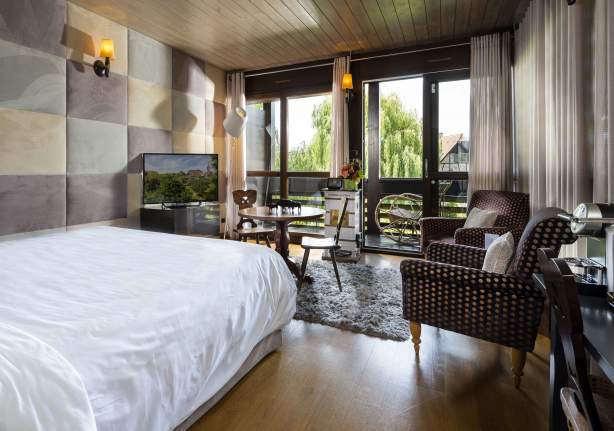 Man muss es der Arbeit des Dekorateurs Alphonse Humbert danken, dass sich durch diese sehr moderne Zusammenstellung eine äußerst beruhigende Atmosphäre im Zimmer ausbreitet. Weil die Hausherrn es aber ebenso lebhaft lieben, finden sich auf den Vorhängen rote Mohnblumen wieder!