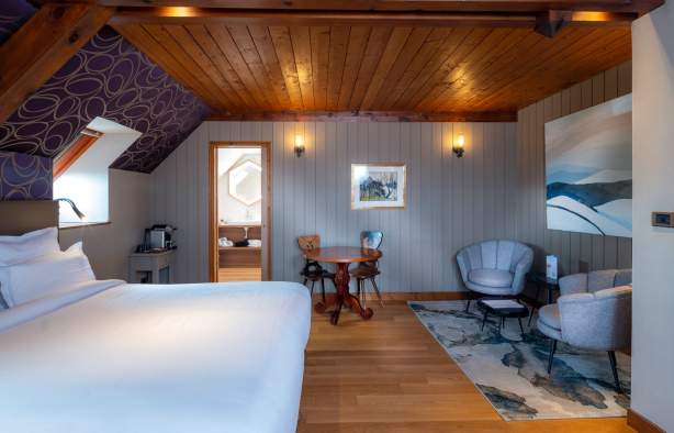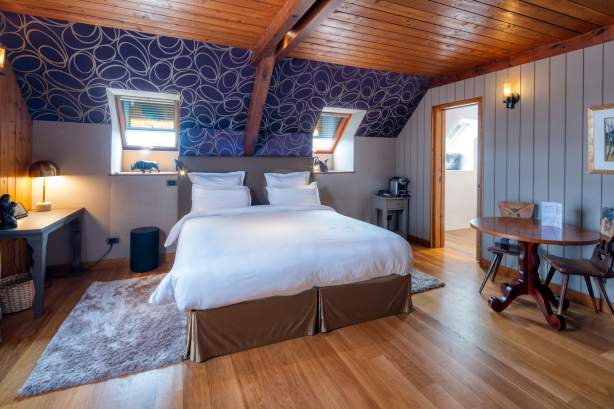 In diesem Dachzimmer, in dem traditionelle Vertäfelungen mit Motiven stiliserter Voluten abwechseln, fühlt man sich fast wie in einem Wald.
