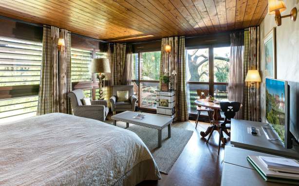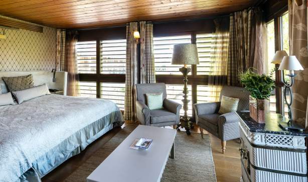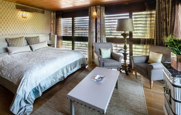 Ein bequemer und warmer Kokon, in dem sich das Leder des äußerst schick entworfenen Kopfende des Bettes wunderbar mit dem Parkett aus Holz und den Fensterläden vereint.