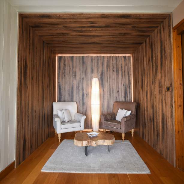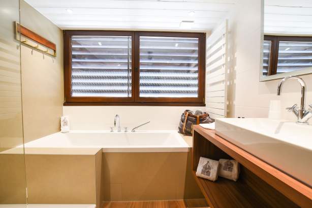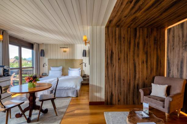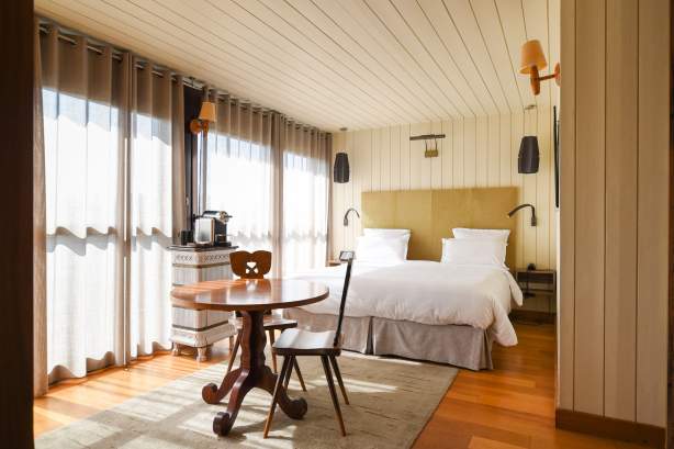 A unique creation where the delicate and sophisticated design can be seen throughout the decoration: harmonious cream and light green colours, animal-hide style headboard... There’s a real feeling of lightness from the sunlight coming through the windows!