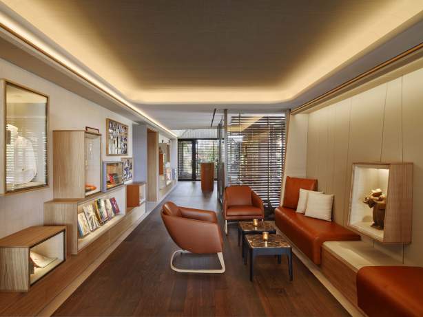 Tout autour du bar central, les niches en cuir recèlent produits et objets intimement liés à L’Auberge de l’Il et à sa renommée.