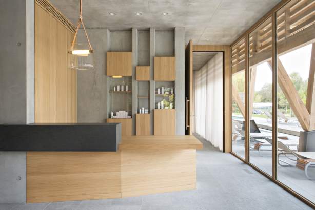 À peine le seuil franchi, vivez un voyage sensoriel. Le regard est irrésistiblement attiré vers ce béton brut pur et sobre, vers ce chêne massif à la fois lumineux et chaleureux.